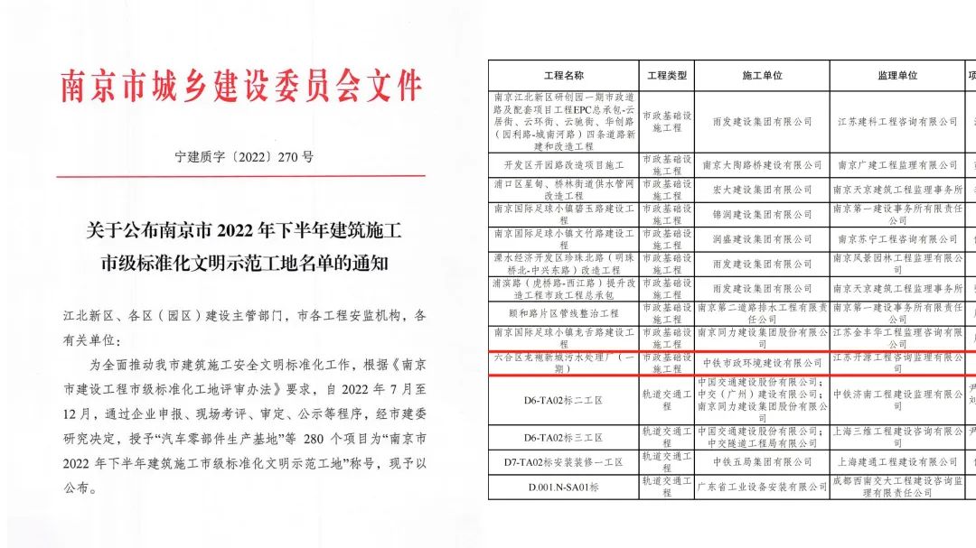 近日,南京市城鄉(xiāng)建設(shè)委員會(huì)發(fā)布了《關(guān)于公示南京市2022年下半年建筑施工市級標(biāo)準(zhǔn)化文明示范工地名單的通知》,公司承建的南京市六合區(qū)龍袍新城污水廠(一期)榮獲南京市2022年下半年建筑施工市級標(biāo)準(zhǔn)化文明示范工地。...