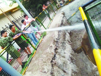 在管道內(nèi)淤泥疏松后,需大量的水對(duì)管道內(nèi)進(jìn)行沖洗,為保證用水,市消防局安排了一輛消防車專門支持管道沖洗。據(jù)悉,消防車一次能提供15立方米的水,可以使用半小時(shí)。但工地附近無消防栓,每次加水均要回到消防隊(duì),導(dǎo)致施工難度大、功效低。
