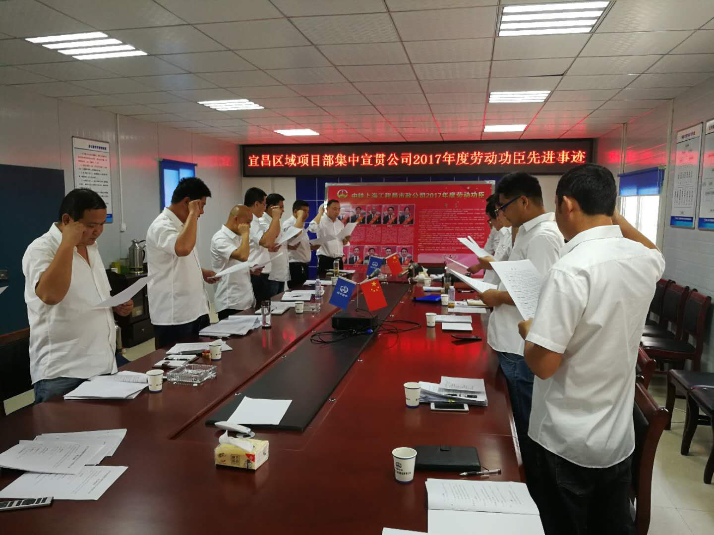 ☆4月19日,宜昌區(qū)域項(xiàng)目部組織干部職工宣貫公司2017年度“勞動(dòng)功臣”先進(jìn)事跡。宣貫會(huì)上,首先由區(qū)域項(xiàng)目黨總支書記向大家介紹了公司2017年度“勞動(dòng)功臣”的先進(jìn)模范事跡,督促各項(xiàng)目全體干部職工向“勞動(dòng)功臣”學(xué)習(xí),弘揚(yáng)敢于爭(zhēng)先、勇創(chuàng)一流的工作精神,營(yíng)造人人學(xué)當(dāng)先進(jìn)、事事爭(zhēng)做楷模的良好氛圍。隨后,由桔鄉(xiāng)路項(xiàng)目經(jīng)理領(lǐng)誓,帶領(lǐng)大家莊嚴(yán)宣讀公司誓言。最后,全體與會(huì)人員依次在簽名板上簽名,表達(dá)自己向公司“勞動(dòng)功臣”努力學(xué)習(xí)并付諸實(shí)踐的決心。(馮理欽)